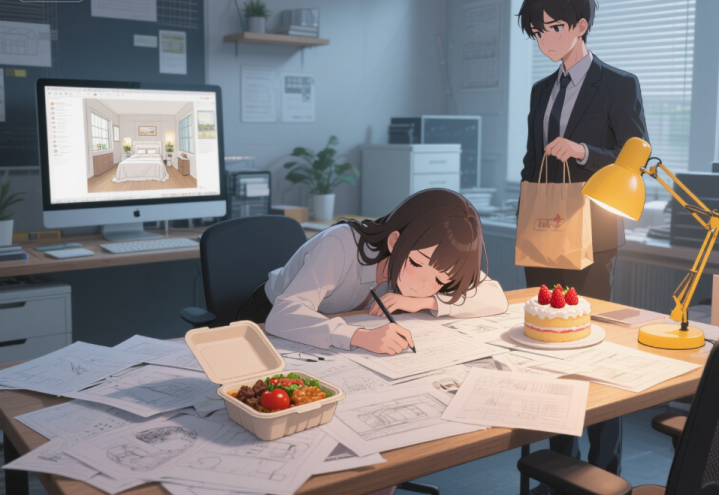 我抬起头,看着她手里拎着的购物袋,里面装着我爱吃的草莓蛋糕。“我就是…… 没心思收拾,” 我揉了揉酸涩的眼睛,“这个婚房方案客户催得紧,我想赶紧改完。”